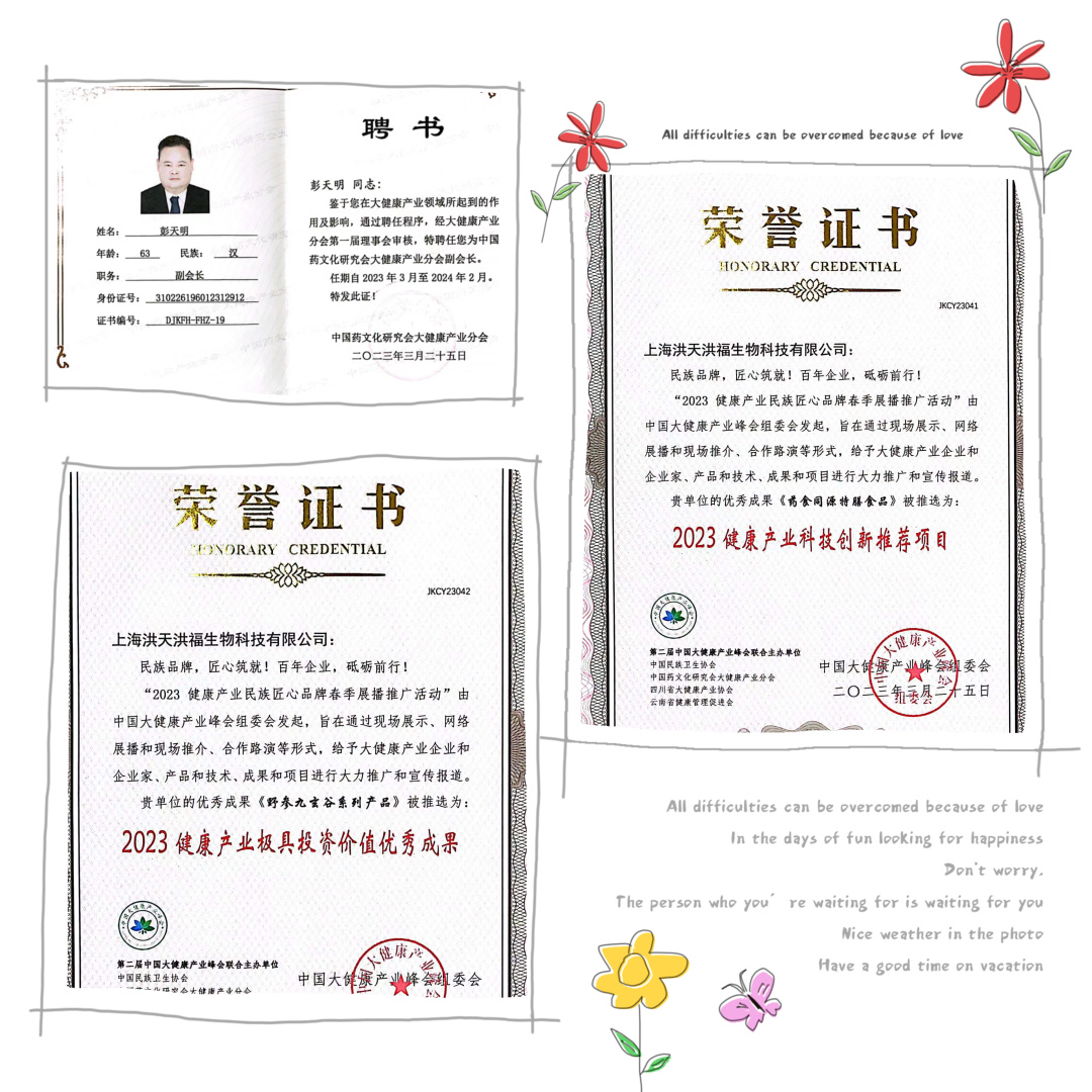 上海洪天洪福生物科技有限公司董事长彭天明先生也应邀参加了此次盛会,获得了“2023健康产业极具投资价值优秀成果”,“2023健康产业科技新推荐项目“,并被特聘任为“中国药文化研究会大健康产业分会副会长”。